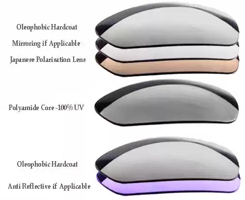 They Perform: All our lenses are crafted from optically superb polyamide or polycarbonate material and are coated to give glass like optical clarity. Our SFx lenses are 60% lighter than glass and are much stronger. All our SFx polarized lenses and silver mirrored lenses have a super hydrophobic coating that makes cleaning and repelling water during strenuous activities a breeze. They stay clear so you can perform in any conditions